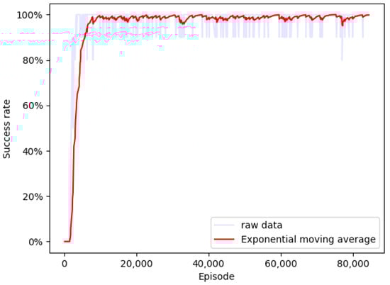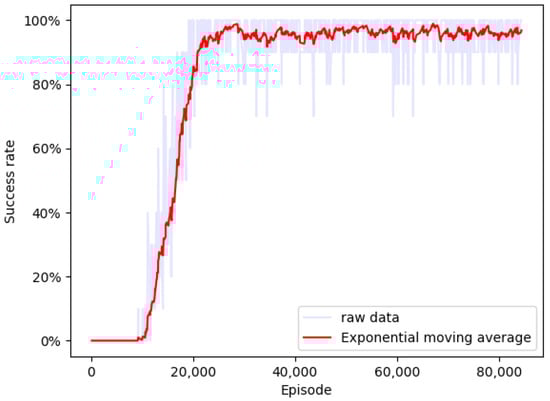 Using the trained LSTM, which acts as the predictor of the position of the moving obstacle, the proposed SAC-based path planning agent is trained. It is assumed in the simulation-based case study that is obtained from the environment and it is given to the trained LSTM in order to compute . The five neural networks for the proposed SAC-based path planning in Figure 3 are trained through 100,000 episodes using a Nvidia GeForce RTX 3080Ti GPU and AMD Ryzen 5 5600X CPU. The networks are implemented using Tensorflow 2.5. It takes 19 h for the training. In addition, for 100,000 episodes, random starting and goal points are used at the beginning of each episode. Figure 7 shows the success rate of path creation in the course of learning 100,000 episodes. Success rates are calculated for every 30 episodes. It can be seen that the success rate converges to about 95% as the learning progress is going on until 100,000 episodes.