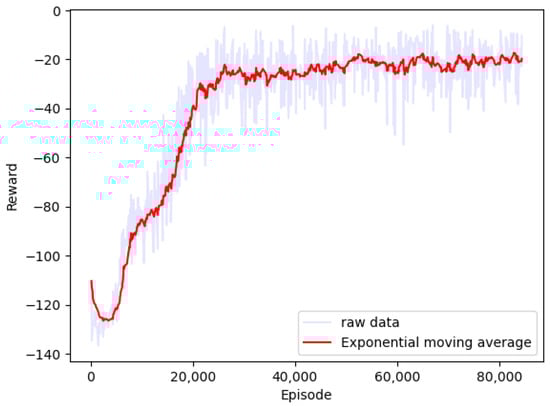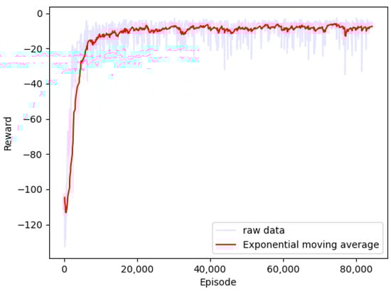 For the evaluation of training performance, not only the success rate but also the reward matters. Figure 8 shows the reward while learning. One of the goals of this paper is to compute the shortest route. As the training goes on, the SAC agent finds shorter paths due to the definition of the reward function in (3). This is why the reward gets better as the training goes on in Figure 8.