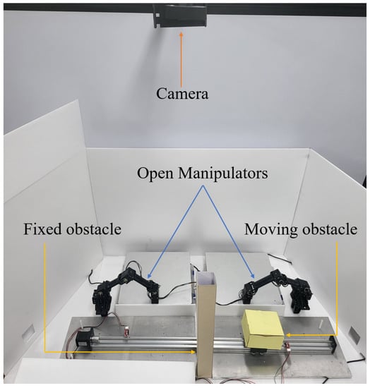 In this subsection, the performance of the proposed SAC-based path planning is tested using two real robot manipulators. For the moving obstacle in the experiment, it is assumed that there is one moving obstacle that moves back and forth along a horizontal line segment. It is also assumed that the obstacle moves with a random speed belonging to a small interval. Figure 14 shows the experimental setup.