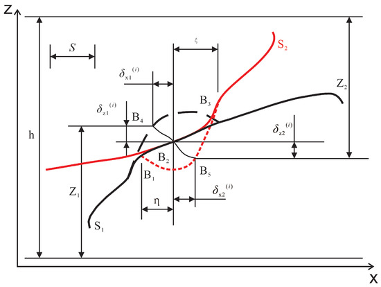 Contacting state of a pair of micro asperity after a relative sliding distances: s, relative sliding distance; h, distance between two reference planes; , , contact surface; , distance in the z-direction of the contact surface s1 before deformation; , distance in the z-direction of the contact surface before deformation; , , distance in x-direction of micro-convex body after deformation; ∂z, displacement in z-direction; ∂, displacement in x-direction.