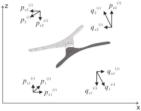 Considering only the contact surface motion in the xz plane and neglecting the y-direction motion and relative rotation, the following decompositions are obtained: = + , = − and = − , = + , where, and , and are projected with equal magnitude and opposite direction in the corresponding directions. Then the slope at the contact point is related to the contact pressure as follows: