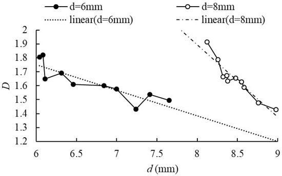 Figure 6 Relationship between d and D. The analysis in Figure 5 shows that the fractal dimension D tends to decrease as the diameter d of biomass pellets increases. This is mainly because as the diameter of the formed pellets increases, the surface roughness becomes rougher, and the D value calculated by the variance method becomes smaller. The reason why the molding diameter d of wood pellets is larger than the diameter d0 of the forming channel is due to the friction caused to the forming channel by the wood chip materials during the compression molding process. Biomass material comes into periodic contact with protruding parts of the die hole surface or ploughs under cyclic loading, and fatigue spalling of the metal material in this area due to repeated plastic hardening [1]. Thus, the diameter of the die hole becomes larger after wearing, the more serious the forming die hole wear, the diameter of forming pellets also increases.