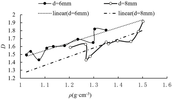 From the Figure 7, it can be seen that the fractal dimension D tends to increase as the density of biomass pellets increases. This is mainly because the greater the density of the pellets, the tighter the bonding between the pellets, the better the denseness, and, therefore, the smoother the surface of the pellets, and, therefore, the greater the D value calculated by the variance method.