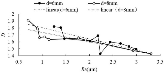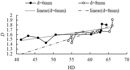 Table 1 indicates the actual diameter d values of the compressed biomass forming pellets under the ring die forming die hole d0 = 6 mm and 8 mm, as well as their corresponding density , surface roughness Ra, and surface hardness HD, while the surface morphology is calculated using the variational method, and the fractal dimension D values corresponding to the surface morphological characteristics are derived using Equation (10). For d0 = 6 mm, the fractal dimension of the particles ranged from 1.494 to 1.806, but mostly concentrated around 1.6; for d0 = 8 mm, the fractal dimension ranged from 1.430 to 1.914, but mostly concentrated around 1.6, indicating that the fractal dimension of biomass pellets are an isotropic and at the same time self-similar [24,25].