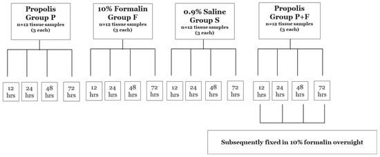 According to the manufacture, the liquid contains 2 g of propolis extract. Hence, the concentration of propolis was established according to the following formula (Dixon-Massey formula, 1957): weight (w)/volume (v)% = weight of the solute/volume of solution × 100. (w/v% = 2/30 × 100, which is 6.66%.) Each group was fixed in their solution at room temperature (20–25 °C) for different time points (12, 24, 48, and 72 h). Only Group P + F was subsequently transferred to 10% buffered formalin overnight (Figure 2).
