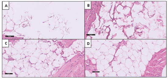 Photomicrographs of a hematoxylin–eosin-stained section of adipose tissue showing the scoring system. (A) Score 1: loss of cell wall integrity in most of the adipocytes. (B) Score 2: shredded cell wall with minimal preservation of the cell wall of some adipocytes. (C) Score 3: fair preservation of the cell wall of adipocytes. (D) Score 4: normal preservation of adipocytes (20×).