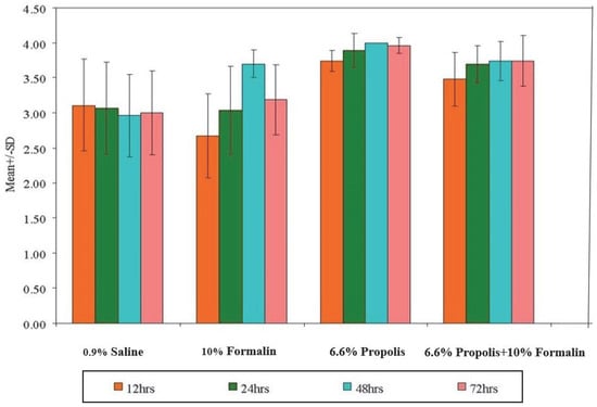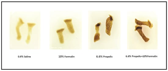To the best of our knowledge, no study in the current literature has been conducted to investigate the fixative properties of propolis. However, several other investigations have been conducted to find alternative natural solutions to be used as substitutes for formalin. For example, honey has demonstrated promising fixative properties [25]. Sugar syrup and jaggery have also shown encouraging results as alternative natural fixative agents [8].
