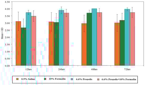 In this study, propolis displayed promising results in terms of tissue fixation at all time points. Propolis composition may play a role in its effectiveness as tissue fixative and its superiority over 10% formalin. Propolis is composed mainly of a mixture of resin (40–50%), wax (25–30%), essential oils (10%), pollen (5%), and organic compounds such as steroids, amino acids, and polyphenols [24]. The stickiness of propolis may protect tissue samples from the invasion of various pathogens (putrefaction) and reinforce cellular structure integrity [24]. Furthermore, the presence of a mixture of resin and wax in the propolis composition could contribute to the crosslinking of tissue molecular proteins, which accelerates and enhances its fixation ability. Organic compounds, by their scavenging action, prevent tissue putrefaction and autolysis due to their antimicrobial and antioxidant effects, and this may also improve propolis fixation properties [19]. This could explain why the tissue samples that were placed in propolis were firmer during grossing and fixed faster at 12 h and improved over time when compared to 10% formalin, where its fixation capacity improved after 24 h.