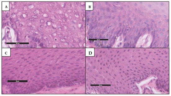 Photomicrographs of a hematoxylin–eosin-stained section of lower 1/3rd of epithelium at 48 h (40×): (A) 0.9% saline; (B) 10% formalin; (C) 6.6% propolis; (D) 6.6% propolis followed by 10% formalin.
