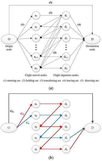Arc: An arc is a directed edge representing the dynamic trend of the gate. The entering arc O A is the direction from the origin node O to the flight arrival nodes a i , indicating the allocation status of the corresponding gate designated for the arrival flight. Its existence means that the corresponding gate is occupied. The holding arc A B is the direction from the arrival to the corresponding departure flight, indicating the gate’s continuous occupancy status. That is, the related aircraft is receiving ground service. The transferring arc B A points to the direction of the next arrival flight to be allocated from the departing flight that has been serviced, indicating the next flight served by the designated gate. This type of arc exists if the landing time of the arrival flight to be allocated is greater than the departure time of the last flight currently served by the gate. A buffer time greater than a certain buffer time is required between the two flights operated by the same gate. The leaving arc B D is the gate recovery arc, which flows from the corresponding flight departure node d j to the destination node D , indicating that the gate is idle and is about to be recycled. The directing arc O D flows directly from the origin node O to the destination node D , indicating that the gate is never occupied. The arc set can be concluded as follows: