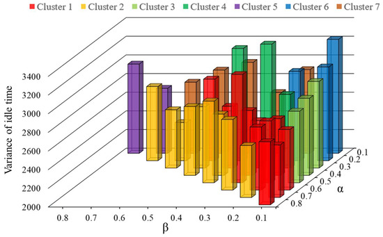Although cluster analysis can provide decision makers with initial insight into the weight setting, the authors found that different combinations of weights within the same cluster may correspond to the same objective function value. Moreover, further analysis of allocation results reveals that even in the same cluster, its related performance still has great uncertainty, especially the idle time of the gates. According to the relevant description in the past literature [26], the idle time variance is calculated by g = 1 G j = 1 F S j , g 2 , where S j , g refers to the last idle time at gate g until the arrival of the flight j . Figure 4 presents the variance of idle time corresponding to each allocation under different clusters. It can be clearly deduced that the variance of idle time can be large or small, which fluctuates in the range of 2400–3300. In addition, the Pearson correlation coefficient between the variance of idle time and the cluster ID is 0.11, indicating that there is no significant correlation. Since the variance of idle time can reflect the sensitivity of gate allocation to variations in flight schedule (that is, the robustness of gate allocation), this performance indicator has been regarded as an important optimization objective in previous studies [24,25,26]. However, this paper focuses on the three stakeholders of passengers, airlines, and airports, and it is only used as an auxiliary performance metric for selecting weight combinations. When the value of each objective function is the same, the allocation result with the smallest variance of idle time is given priority to balance the idle time of each gate and alleviate the adverse effects caused by flight delays in actual operations. In the following experiments, the weight combination corresponding to the minimum idle time variance is selected, and its optimal solution is taken as the final gate allocation result.