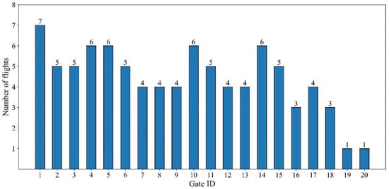 Based on the criterion of minimum idle time variance, the final weight combination is set to α = 0.2 , β = 0.6 , γ = 0.2 . Its optimized objective values for gate cost, taxi time, and walking distance are 4.2, 494,155.2, and 19,500,658, respectively. As shown in Figure 5, the gate allocation results are visualized using a Gantt diagram, where the dark blue represents the occupied time of each flight, and light blue represents the buffer time. Correspondingly, the distribution of the number of flights assigned to each gate is provided in Figure 6.