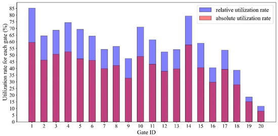 In addition, we also counted the relative utilization rate and absolute utilization rate of each gate, as shown in Figure 7. On the whole, the utilization rate of the contact gate is relatively high, except for the remote gate. Additionally, the absolute utilization rate of most of them is above 40%, while the relative utilization rate is above 55%. Similar to the distribution of the number of flights, G1 has the highest absolute utilization and relative utilization, while G16 and G18 have the lowest. From the above conclusions, it can be found that the established multi-objective optimization model for gate allocation can effectively balance the interests of multiple parties and obtain a higher utilization rate. On the premise of ensuring relevant interests, by considering the robustness of the allocation results, the number of flights and the idle time at each gate are also balanced, thereby reducing the difficulty of airport management.