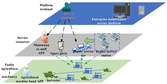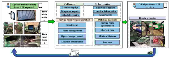 Food security is an important context for work all over the world. The cross-regional operation of combine harvesters has led to a significant guarantee of food security in China. Due to China’s geography, seasons and production environment, the harvest season in China is seasonal and time-phased [1]. Meanwhile, due to the agricultural environment in China, such as small plots of land being owned by farmers and the wide distribution of farmland [2], a combine harvester can not only satisfy the use needs of their owners, but also provide services for families without agricultural machinery, bringing economic income to the owners of agricultural machinery, and performing harvest tasks for other regions in China. Thus, agricultural machinery operation teams are constantly being formed, and agricultural machinery enterprises provide these operation teams with order information and guarantee the maintenance servicing of the agricultural machinery through the management of resources and agricultural machinery [3,4]. Agriculture 4.0 marks a rapid increase in connection and the sensing of various information resources across regions, resources and systems [5]. The effective allocation and deployment of agricultural service resources is key to accelerating the rapid development of the post marketization of agricultural machinery. Traditional agricultural machinery maintenance services, mostly based on manual experience, adopt self-repair while finding other similar mechanical equipment maintenance shops nearby when encountering problems related to the failure of agricultural machinery. However, due to the lack of knowledge regarding agricultural machinery, it is difficult to solve problems related to the failure of agricultural machinery, while at the same time, this affects the efficiency and duration of agricultural machinery operation. The effective collaborative management of various elements in agricultural machinery production service scenarios can provide many innovative solutions for the modernization of the agricultural sector [6].