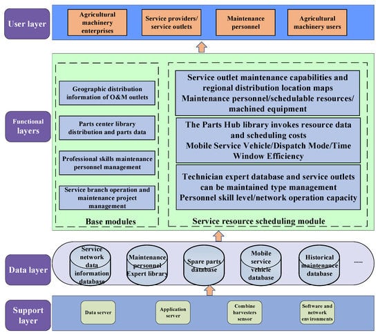 As shown in Figure 5, in view of the diversified service demands of combine harvesters under different operation and maintenance modalities, the density of agricultural machinery in regional operations was taken as the main basis in the current study. Considering factors such as production seasonality, workload, regional environment, operating conditions, and agricultural machinery status, operation and maintenance forecast information was adopted on the basis of historical information and big data analysis. Comprehensive resource information analysis and mining of available technology, such as with respect to cluster operation service requirements, multi-level service network distribution, spare parts reserves, and service vehicles and personnel, were studied, and the problem of the extensive allocation of service resources was solved, thereby improving the effectiveness of resource allocation.