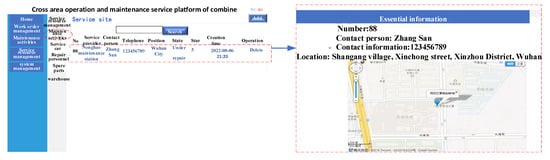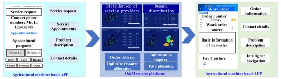 There are two main operation and maintenance modes in maintenance scenarios: service network maintenance and scheduling maintenance. Service network maintenance sends a query to the agricultural machine operators, displays the maintenance resources available in the service area through the app, and provides information on the available maintenance network for agricultural machine operators, as well as the available spare parts available in the current area. Maintenance scheduling mainly provides regional maintenance network information, maintenance personnel information, and information on replacement spare resources with respect to the fault maintenance location reported by the agricultural machinery operators. Agricultural machinery operators are able to choose between active maintenance and prompt maintenance using the platform.