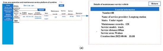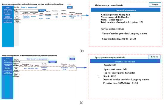 The management of maintenance service resources for combine harvesters includes the management of maintenance service vehicles, the management of maintenance personnel, and the management of spare parts resources. As shown in Figure 8a, the on maintenance service vehicle module includes the vehicle’s license, the service provider, the historical record of participation in maintenance, contact information, status, whether it can provide cross-regional service, service vehicle type, service distance and time. As shown in Figure 8b, the maintenance personnel module of the operation and maintenance service platform includes the service provider to which the maintenance personnel belong, the number of completed maintenance tasks, the historical maintenance failure type, the service area they are responsible for, and any evaluation indicators. As shown in Figure 8c, the spare parts management module provides a way to quickly handle faults during the maintenance process, and includes the name of the spare part, the type of spare part, the quantity in stock, and the service provider to which the spare part belongs.
