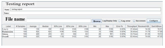 The research and application of the cross-regional operation and maintenance service platform of the combine harvester presented in this paper adopted a three-tier C/S architecture, and used Apache JMeter software to test the static and dynamic resource performance of the client and server, as shown in Figure 10. The traditional two-tier C/S architecture is a single server, with a local area network at its center. It is difficult to expand this architecture to a WAN in the case of large enterprises, or to the Internet. The combination and integration capabilities of software and hardware are limited by suppliers, making it difficult to manage a large number of clients. Therefore, a three-layer C/S architecture was developed. The three-tier C/S architecture divided the application function into three parts: the presentation layer, the functional layer, and the data layer. The three-layer division is clear and flexible, and is able to adapt to increased numbers of clients and changes in the processing load. C/S architecture, B/S architecture, two-tier C/S architecture, and three-tier C/S architecture were compared, and the results of the comparison are shown in Table 2.