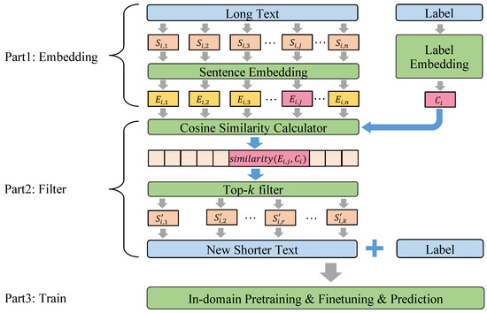 - The second part is the long text filtering module. This module first calculates the cosine similarity between each sentence segment of the long text and the label word; then, it filters and retains the most similar top-k sentence segments and finally recombines the top-k sentence segments to form a new shorter text. With the help of this module, the purpose of compressing the long text is realized.