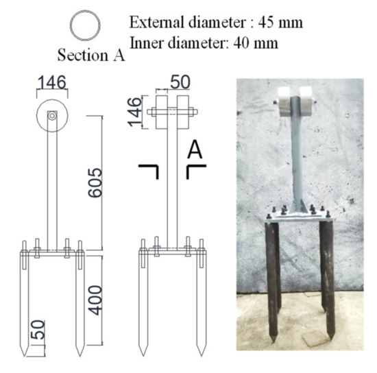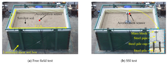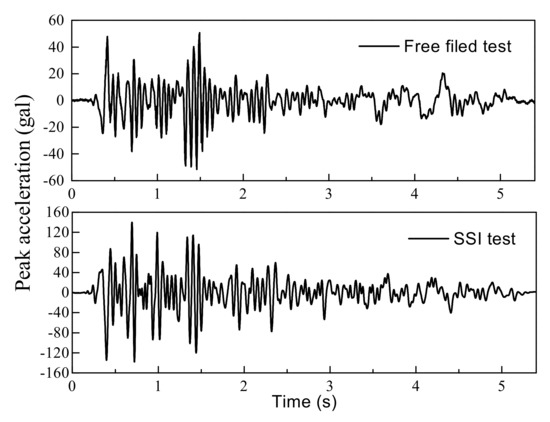 To verify the reliability of the above numerical method, simulations on the free field test and SSI test in a scaled model experiment [28] were conducted using the introduced numerical model. The scaled model experiment was conducted in the Structural Engineering Laboratory of Southeast University, as shown in Figure 3. In the scaled model experiment, the scale factors of the density, elastic modulus, and length are 1:1.5, 1:6, and 1:20, respectively; the size, density, and shear wave velocity of soil in the hypothetical prototype soil are 58 m × 40 m × 25 m, 1.65 ton/m3, and 120 m/s, respectively, and those of scaled soil are 2.9 m × 2.0 m × 1.25 m, 1.1 ton/m3, and 60 m/s, respectively. The height and period of the hypothetical prototype SDOF structure are 12.1 m and 0.5 s, respectively, and those of the scaled SDOF structure are 6.05 m and 0.05 s, respectively. The specimen of the scaled SDOF structure with pile foundations is shown in Figure 4. The scaled soil with a density, height, and shear wave velocity of 1.1 ton/m3, 1.25 m, and 120 m/s was placed in a laminated shear soil box [29,30,31] with a clear size of 2.9 m × 2.0 m × 1.54 m. The time–history curves of the seismic records used in the free field test and SSI test are shown in Figure 5. The acceleration in the center of the surface soil was measured in the free field test, and the acceleration at the top of structure was measured in the SSI test.