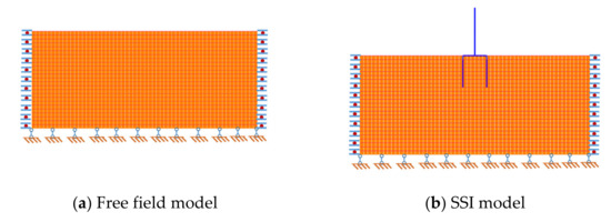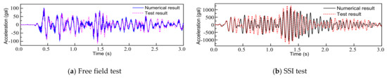 Based on the elevation dimension of the scaled model, the plane finite element models of the free field and SSI system were established and are shown in Figure 6, where the element size was set as 0.05 m because this size can ensure the influence of the element size is negligible [32]. Dynamic time-history analyses were conducted on the free field model and SSI system model using the seismic records in Figure 5. The comparisons of the experiment and simulation results of the acceleration in the center of the surface soil and the acceleration at the top of the superstructure are shown in Figure 7a,b, respectively. It is found that the experiment results are in good agreement with the simulation results in the time domain, indicating that the above numerical method is reliable and can be applied to the subsequent numerical study.