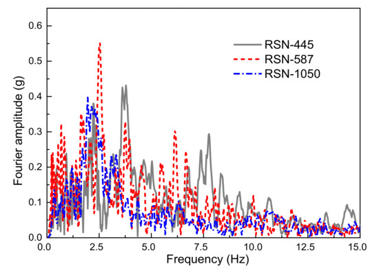 Considering the soil shear wave velocities (Vs) of most building sites are within the range of 150 to 500 m/s, the vs were respectively set as 150, 250, 350, and 500 m/s to roundly investigate the influence of the soil shear wave velocity on the SSI effect. To investigate the influence of the spectral characteristics of seismic records on the SSI effect, three ground motion records with different spectral characteristics were selected from the PEER Ground Motion Database, and the peak accelerations of the three ground motion records were adjusted as 100 gal (cm/s2). The detailed information of the three records is given in Table 1, where the Rjb (Joyner–Boore distance) [34] is the shortest distance to the surface projection of the fault plane. The comparison of the Fourier spectra of the three records is shown in Figure 8.