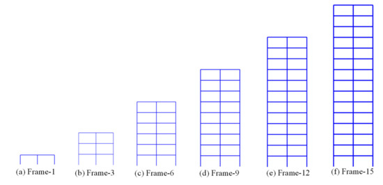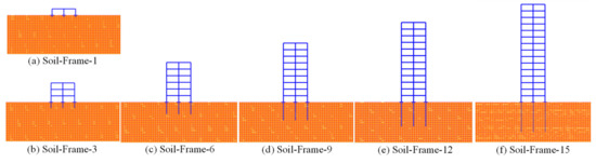 The numbers of floors for RC-frames are generally no more than 15 in reality. Therefore, 1-, 3-, 6-, 9-, 12-, and 15-story RC-frames (Frame-1, Frame-3, Frame-6, Frame-9, Frame-12, and Frame-15) were designed to roundly investigate the influence of the structure height, in which the span lengths and story heights of RC-frames were 6.0 and 3.3 m, respectively. The elevations of the fixed-base RC-frames and RC-frames considering SSI are shown in Figure 9 and Figure 10, respectively. Regarding the RC-frames, the reinforcing bar is the HRB400 with a nominal yield strength of 400 MPa, and the concrete is C35 grade concrete with a nominal cubic compressive strength of 35 MPa [35]. The detailed parameters of the RC-frames and their pile foundations are shown in Table 2. Conducting modal analyses on fixed-base RC-frames, it can be obtained that the periods of Frame-1, Frame-3, Frame-6, Frame-9, Frame-12, and Frame-15 are 0.127, 0.384, 0.713, 1.091, 1.493, and 1.876 s, respectively. Regarding the soils in the soil–structure systems, the length of soil parallel to the seismic excitation direction should be greater than five times the width of the structural foundation to ensure the influence of the artificial boundary of the soil is slight [36]; the size of the soil element should not exceed (1/5~1/8)Vs/fmax to prevent the high frequency components of seismic records from being filtered out, where vs. denotes the shear wave velocity of soil and fmax denotes the maximum frequency of the seismic record. Accordingly, the length of soil parallel to the seismic excitation direction was determined as 60 m, and the length of soil element was set as 1.0 m. In addition, the thicknesses of soils in the soil–structure systems were set as 20 m based on the recommendation of the Chinese code [3].