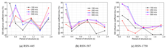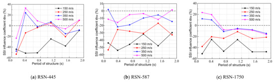 Figure 12 shows that the curves of esd have a significant difference compared with the curves of ebs shown in Figure 11 in some cases, indicating that the influence of SSI on the maximum base shear does not always have a positive correlation with that on the maximum story drift. The maximum value of esd of the 1-story RC-frame is up to 95%, as shown in Figure 12c, and a similar phenomenon can also be seen in Figure 12a,b, indicating that considering SSI can significantly increase the maximum story drift of low-rise structures built on tough soil. Figure 11 and Figure 12 show that the influence of SSI on the structural maximum story drift and base shear is closely related to the structure frequency, spectral characteristic of the seismic record, and soil shear wave velocity.