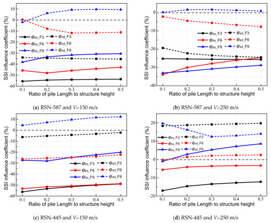 Considering the ratios of the pile length to the structure height for most pile-supported RC frames are between 0.1 and 0.5 in reality, the ratios of the pile length to the structure height of the 3-story, 6-story, and 9-story RC-frames (F3, F6, and F9) were set as 0.1, 0.2, 0.3, 0.4, and 0.5 to investigate the influence of the pile length on the SSI effect. To sufficiently capture the influence of the pile length, the seismic records RSN-587 and RSN-445 with a peak acceleration of 100 gal were employed as seismic inputs, and the values of vs. were, respectively, set as 150 and 250 m/s. It can be seen from Figure 13 that with the increase in the pile length, the values of ebs generally increase with the increase in the pile length while the values of esd may increase or decrease. Moreover, the maximum influence of the pile length on ebs and esd is only about 10%. The above finding indicates that in general, the maximum base shear of the structure considering SSI increases with a larger pile length while the influence of the pile length on the structural base shear and story drift is within 10%.
