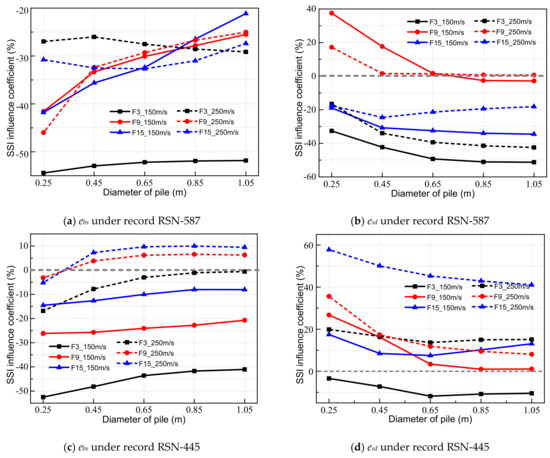 To investigate the influence of the pile diameter on the SSI effect, the pile diameters of the 3-story, 9-story, and 15-story RC-Frames considering SSI were, respectively, set as 0.25, 0.45, 0.65, 0.85, and 1.05 m for comparison. In this section, the seismic records RSN-587 and RSN-445 with a peak acceleration of 100 gal were used as seismic inputs, and the values of vs. were, respectively, set as 150 and 250 m/s to fully investigate the influence of the pile diameter. Figure 14a,b show that the maximum and minimum values of ebs for F9 built on soil with vs. of 250 m/s are −25.0% and −46.0%, and those of esd for F9 built on soil with vs. of 150 m/s are 37.5% and −4.8%, respectively. The maximum influences of the pile diameter on ebs and esd are, respectively, up to 21% and 42%, indicating that the influence of the pile diameter on the SSI effect is significant in some cases. Moreover, the influences of the pile diameter on the values of ebs and esd with different structure frequencies, soil shear wave velocities, and seismic records are different, which is related to the soil shear wave velocity, structure frequency, and spectral characteristic of the seismic record. In addition, Figure 14 shows that with the increase in the pile diameter, the values of ebs and esd, respectively, increase and decrease in most cases, indicating that in general, the maximum base shear and story drift of RC frames, respectively, increase and decrease with a larger pile diameter. The reason for the above phenomenon is that in general, a larger pile diameter can transmit a bigger seismic force to the superstructure and produce a more significant inhibitory effect on the rocking of the superstructure.