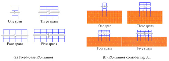 The influence of the span number on the SSI effect has commonly been neglected while investigation of the influence of the span number on the SSI effect is of great significance to accurately evaluating the seismic demands of structures with different spans. To investigate the influence of the span number on the seismic demands of different structures, 3-story, 9-story, and 15-story RC-frames with different spans were designed and are shown in Figure 15, in which the span numbers were, respectively, set as 1, 2, 3, 4, and 5; and the periods of the fixed-base structure with different spans and the same height were the same. The seismic record RSN-587 with a peak acceleration of 100 gal was used as seismic input, and the values of vs. were set as 150 and 250 m/s, respectively.