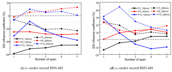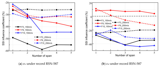 It can be seen from Figure 16 that the maximum influences of the span number on the values of ebs and esd are, respectively, up to 25% and 40% when vs. is 150 m/s and reduced to 15% and 30% when vs. is 250 m/s. With the increase in the span number, the values of ebs and esd decrease in most cases and increase in some specific cases. The results point out that the influence of the span number on the SSI effect can be significant under the condition of soft soil, which decreases with a lager soil shear velocity in general. The influence of the span number on the maximum base shear and story drift has no obvious laws, which is closely related to the structure frequency, soil shear wave velocity, and spectral characteristic of the seismic record.