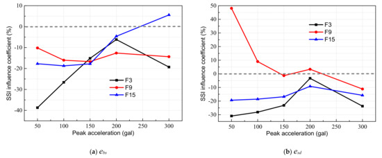 The soil will undergo large nonlinear deformation under strong earthquakes, which will inevitably have an impact on the SSI effect. To investigate the influence of the seismic intensity on SSI, the seismic records RSN-587 with a peak acceleration of 50, 100, 150, 200, and 300 gal were employed to conduct seismic excitation on 3-story, 9-story, and 15-story RC-frames considering SSI and without considering SSI. The soil shear wave velocity was set as 300 m/s. It can be found from Figure 17 that the maximum influences of the peak acceleration on the values of ebs and esd are up to 35% and 60% when vs. is 300 m/s. The values of ebs and esd may significantly increase or decrease with the increase in the peak acceleration. The above description indicates that the influence of peak acceleration on the seismic demands of structures considering SSI is significant and irregular, which cannot be neglected when accurately calculating the influence of SSI on the structural seismic demand.