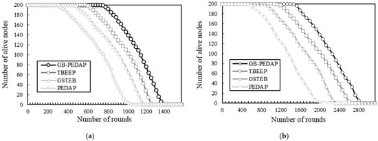 Number of alive nodes under different numbers of rounds: (a) initial energy is 0.25 J; (b) initial energy is 0.5 J.