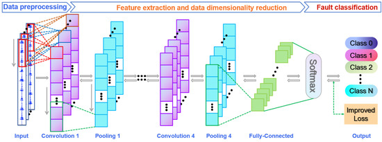 where is the maximum value of , that is, the last layer of CNN, is the output value of the neuron in layer , is the number of categories, and is the output probability value of attributed to class . The output of Equation (4) is a vector with the equivalent size to the number of categories , and each value in the vector represents the likelihood that the input sample is classified in that category. Through this probability vector, the cross-entropy loss is calculated as: