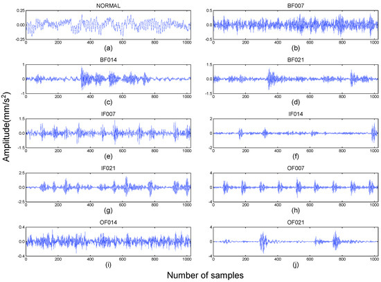 Vibration signals of bearing: (a) normal; (b) ball fault (007); (c) ball fault (014); (d) ball fault (021); (e) inner fault (007); (f) inner fault (014); (g) inner fault (021); (h) outer fault (007); (i) outer fault (014); (j) outer fault (021).