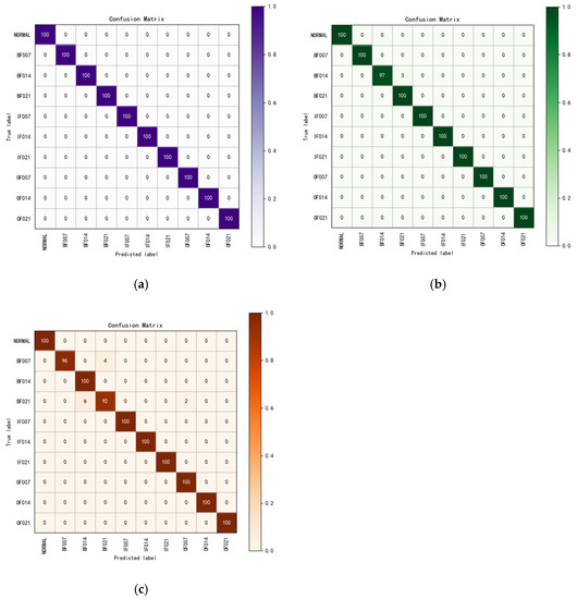 The three datasets in Table 2 are applied to verify the model, and the results are illustrated in Figure 6. For each block in the matrix square, the horizontal side means the predicted category label and the vertical side means the actual category label; the values of the dark-colored left diagonal line are the number of samples correctly predicted by the model for each sample. It is clear that a larger value reflects the superior classification of the model. In Dataset A, all samples were identified correctly. In Dataset B, three samples in BF014 were identified incorrectly. In Dataset C, a total of 12 samples of BF007 and BF021 were identified incorrectly. In summary, the overall identification accuracy of the model on the two unbalanced datasets is 99.25%, of which the average identification accuracy for the minority class samples is 99.16%. From the experimental results, we can conclude that the improved model obtains more excellent accuracy for the minority class samples in the unbalanced fault diagnosis of CWRU-bearing datasets.
