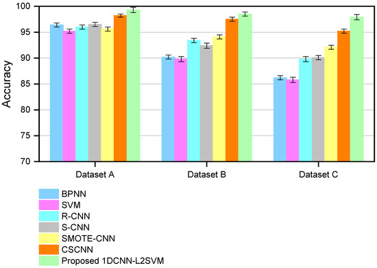Since Dataset A is a balanced dataset, all seven methods obtained high accuracy. In the unbalanced Dataset B, the minority class samples used to train these methods become fewer in number; therefore, the accuracy of all seven methods decreased. Among them, the accuracy of BPNN and SVM decreased to 90.2% and 89.8%, respectively. This is because BPNN and SVM need manual feature extraction before training. However, the manually extracted features are not comprehensive and the key features may be missed, resulting in a rapid decline in accuracy. In addition, the accuracy of R-CNN is 93.4%, S-CNN is 92.4%, SMOTE-CNN is 94.1%, CSCNN is 97.5%, and 1DCNN-L2SVM is 98.5%. Obviously, 1DCNN-L2SVM obtains the highest accuracy because it uses dynamic adjustment parameters and modulation factors to deal with unbalanced data. The samples in Dataset C are more unbalanced than those in dataset B. The accuracy of BPNN decreases from 90.2% to 86.2%, while SVM decreases from 89.8% to 85.8%, R-CNN from 93.4% to 89.8%, S-CNN from 92.4% to 90.1%, SMOTE-CNN from 94.1% to 92.1%, and CSCNN from 97.5% to 95.2%. In contrast, the accuracy of 1DCNN-L2SVM is 97.9%, which is only a 0.6% decrease. Therefore, the proposed 1DCNN-L2SVM outperforms several other methods in unbalanced fault classification.