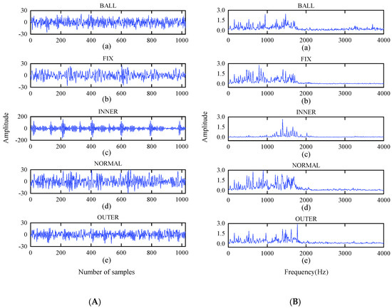 The vibration signals of the bearings are collected at three different speeds of 2600, 2800, and 3000 r/min and represented by A, B, and C, as listed in Table 5. At one speed, five different data samples are collected, which include: (1) a rolling element fault signal, (2) a cage fault signal, (3) an inner ring raceway fault signal, (4) a normal signal, and (5) an outer ring raceway fault signal. Figure 10 describes the time and frequency domain diagrams of those signals.