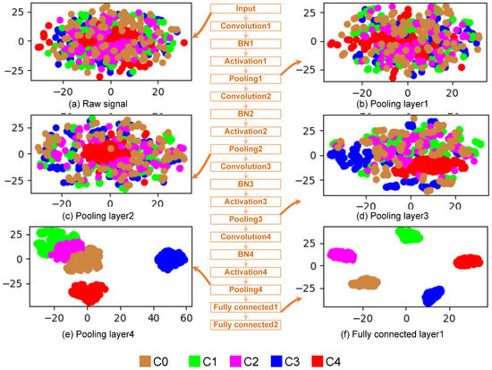 From the above analysis, the original vibration signal can clearly output the signal features hidden in the data to the new space after convolution and pooling. In the process of feature extraction layer by layer, the information learned in the shallow layer is usually simple signal features. Until now, those samples are still difficult to distinguish, and with the increase in the number of network layers, the model can abstract higher dimensional fault features, and various input samples can be well identified according to these features.