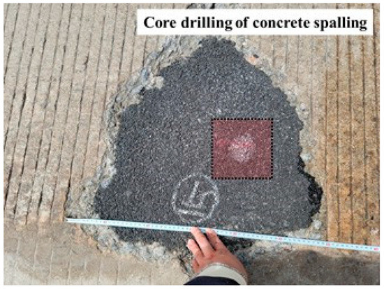 Core drilling position of concrete pavement slab around spalling.