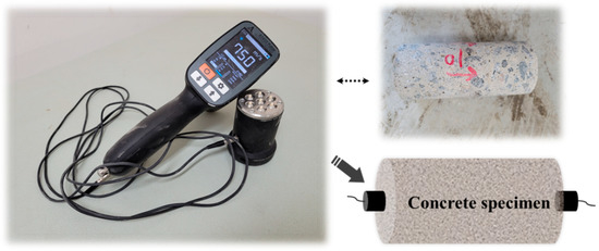 The method used to measure the ultrasonic velocity is divided into indirect and direct methods, but the direct method was used exclusively in this study because of the variability problem of the measurement results. An ultrasonic irradiation device uses ACSA 1410 Pulsar to input the thickness of the core specimens at each measurement and records the average ultrasonic velocity measured three times into contact with both ends of the specimens, as shown in Figure 2.