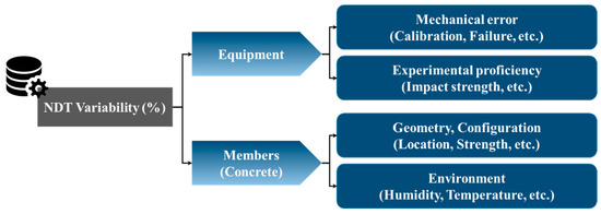 Non-destructive tests can cause errors in measurement results, which are commonly referred to as “NDT variability”, which is caused by the influence of equipment and components. In particular, it can occur significantly depending on the environmental conditions of the site. Therefore, as shown in Figure 3, an NDT variability analysis was conducted separately to assess mechanical errors and variability due to experimental proficiency caused by non-destructive testing equipment and variability due to different conditions, such as the location and thickness of the concrete slabs.