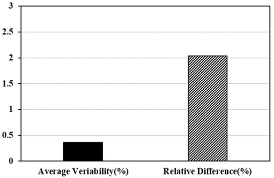 The evaluation results are shown in Figure 5, and the average variability on the left side represents the average coefficient of the inherent error range of the equipment. The relative difference on the right is compared with the ultrasonic velocity of lower core specimens cut in half to show the relative difference in the thickness of the core specimens. If the result was positive (+), the measured results of the cut core specimens were significant, and if it was negative (−), it means that the measurement result of the entire thickness core specimens was large.