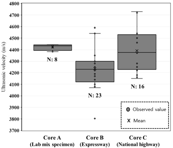 As can be seen in Figure 7, the ultrasonic velocity of the core collected at the site under various conditions is larger than the results of the indoor experiment under limited conditions. This shows that since the ultrasonic wave speed is affected by environmental variables such as relative humidity and temperature, a difference in the ultrasonic wave speed may occur, even in a paved section in a good soundness state. In terms of conservative design and road management, this study developed a methodology for estimating the degradation depth of the pavement by testing the ultrasonic velocity for different locations and environmental conditions and assuming the minimum measurement results for maintaining sound conditions. This method should be understood and regarded as meaningful as a methodological result verifying the degradation depth estimation, which may be lower than the minimum ultrasonic velocity of the good soundness state pavement in this study and the mixing ratio used in the pavement.