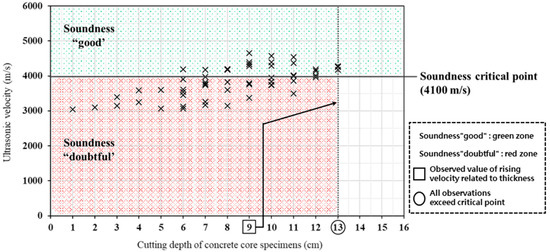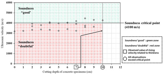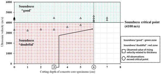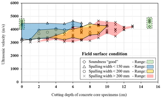 Figure 9 shows the test results for the spalls with width sections < 150 mm, which includes some measurements within the “doubtful” soundness range. When the cutting thickness exceeds 3 cm, the ultrasonic velocity increases slightly, and when the cutting thickness is 6 cm or more, the ultrasonic velocity exceeds the standard ultrasonic velocity of 4100 m/s.