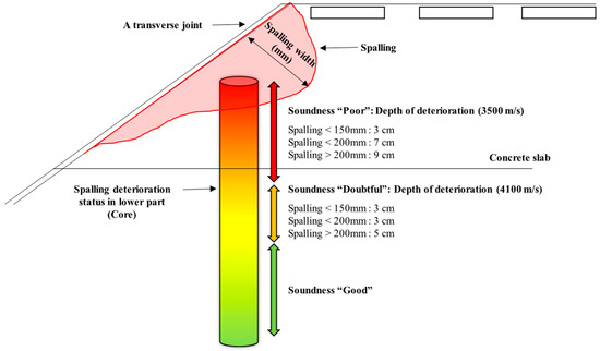 In the case of “very good”, the durability and strength equivalent to the newly constructed concrete pavement were shown, and the ultrasonic velocity of 4400 m/s or higher was based on the test results of the specimens to which the mixing ratio was applied. In the case of the soundness grade “good”, the damage and deterioration of the surface of the slab are not progressing, and an ultrasonic velocity of 4100 m/s or more is used as a reference according to the core test results of road pavement in common satisfying the conditions. In the case of “doubtful” and “poor”, the ultrasonic velocity test results were determined based on the ultrasonic velocity test conducted while removing the deteriorated areas of the spalling damage section, and the ultrasonic velocity was in the range of 3000 m/s to 4100 m/s.