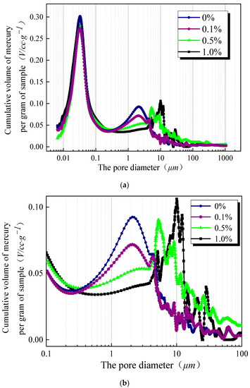 The mercury pressure test is one of the most commonly used methods for conducting tests, such as for studying soil microstructure. The mercury intake versus pore distribution curve and cumulative mercury intake curve can be obtained, and microstructure pore distribution can be visualized through images. Because of metallic mercury’s inability to enter closed pores, part of the fine pores can be easily overlooked. The results of the mercury pressure test on red clay contaminated with different concentrations of Pb2+ in soil samples contaminated for five days are plotted in Figure 1 and Figure 2.