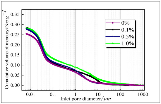 Figure 2 depicts the relationship between the pore size of red clay and the accumulated mercury input volume for various concentrations of Pb2+, which was mercury pressed into a long strip of the soil sample with external pressure. The accumulated mercury input volume corresponds to the unit horizontal coordinate in the figure, which is expressed as the incremental magnitude. With the increase of mercury injection pressure, the content of metal mercury in soil increases, which is consistent with this phenomenon. As shown in the figure, the initial stage occurred when the pore space (100~1000 μm) was large, and the volume of mercury in the soil contaminated with different concentrations of heavy metals was the same; during the rising stage, the increase in pressure in the pore space distribution range of 0.01~100 μm as accompanied by a large amount of mercury leaching into the red clay contaminated by Pb2+. In the stable stage, the level of mercury pressure gradually reached its maximum and tended to stabilize. The metallic mercury injected into the red clay contaminated with various concentrations of heavy metals eventually stabilized and approached the nanoscale pores (range < 0.01 μm). Additionally, due to the increase in heavy metal (Pb2+) concentration in the red clay, the accumulated mercury input in the red clay that was not contaminated with Pb2+ was less than that in the red clay contaminated with Pb2+. This finding coincides with that depicted in Figure 1, where the pore space decdreased in the range of 0.2–4 μm and grew in the range of 4–20 μm. We confirmed that various concentrations of the heavy metal Pb2+ cause different internal pore damage in Guilin red clay. The principle is that Pb2+ erodes a portion of the cemented material within the red clay, causing the original small pores to enlarge. The result is an increase in the total pore volume of the soil.