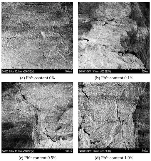 - The results of the electron microscope scanning test further illustrated the results of the mercury piezoelectric test. Under the influence of Pb2+, an increase in the concentration of Pb2+ reduces the thickness of the red clay’s double electric layer, and the interparticle interaction force likewise becomes weaker as a result, producing a similar lubricating effect.
